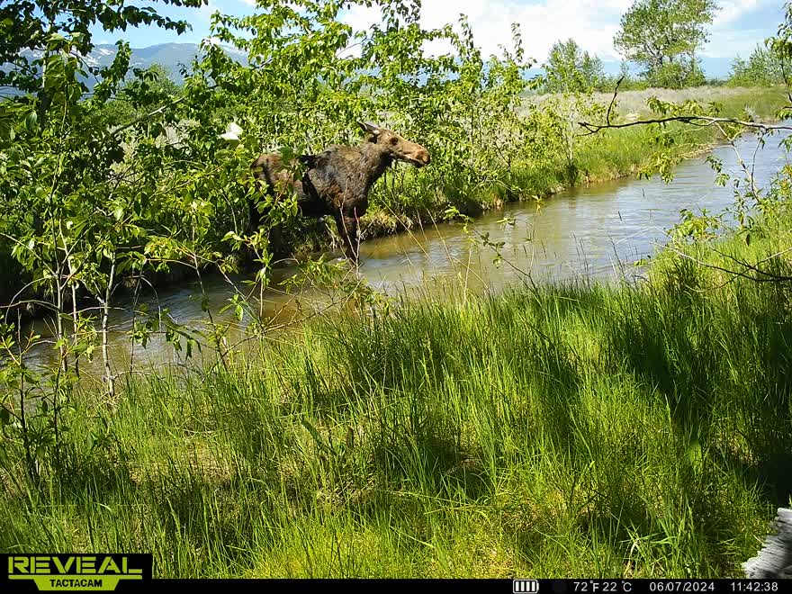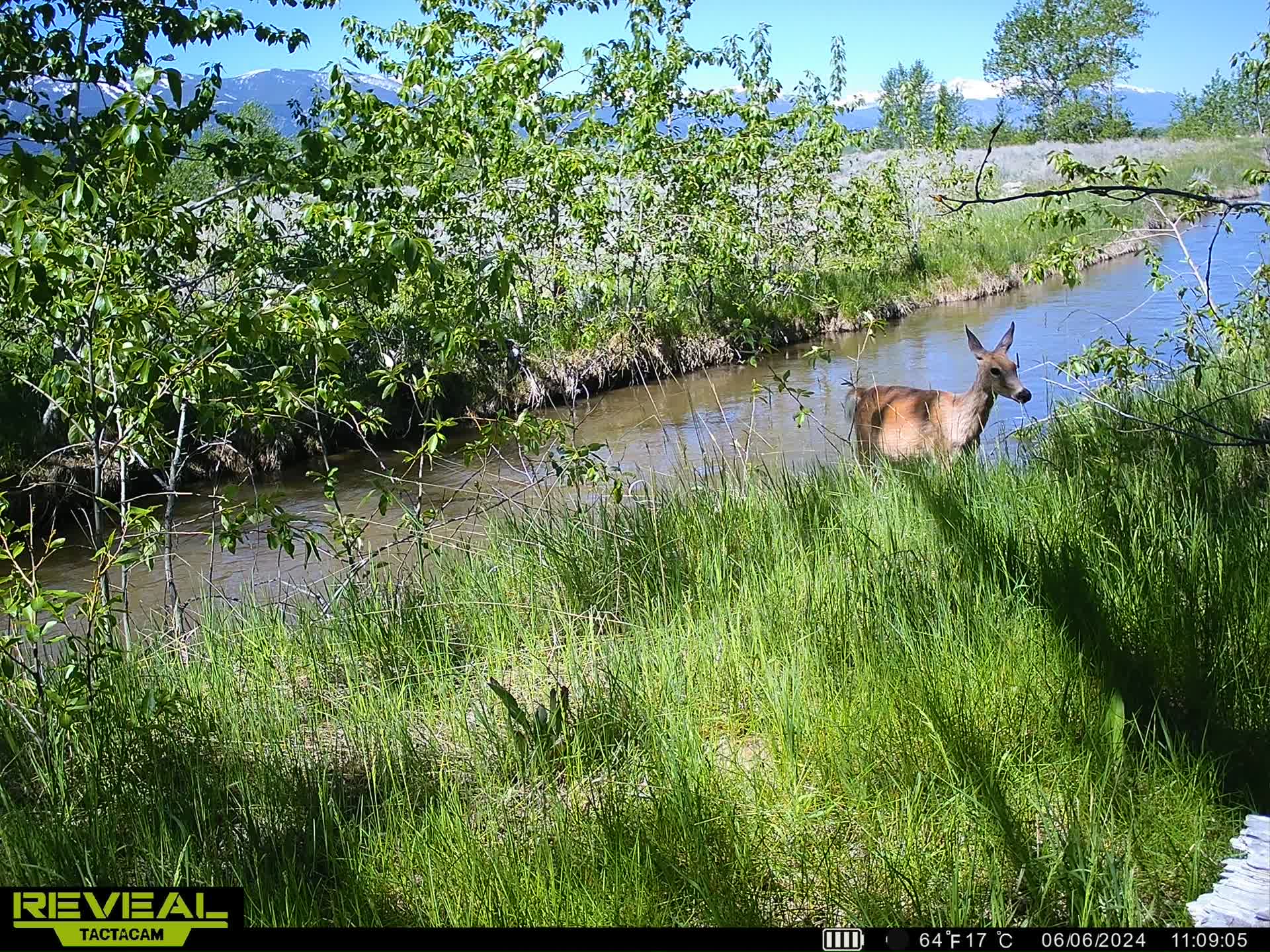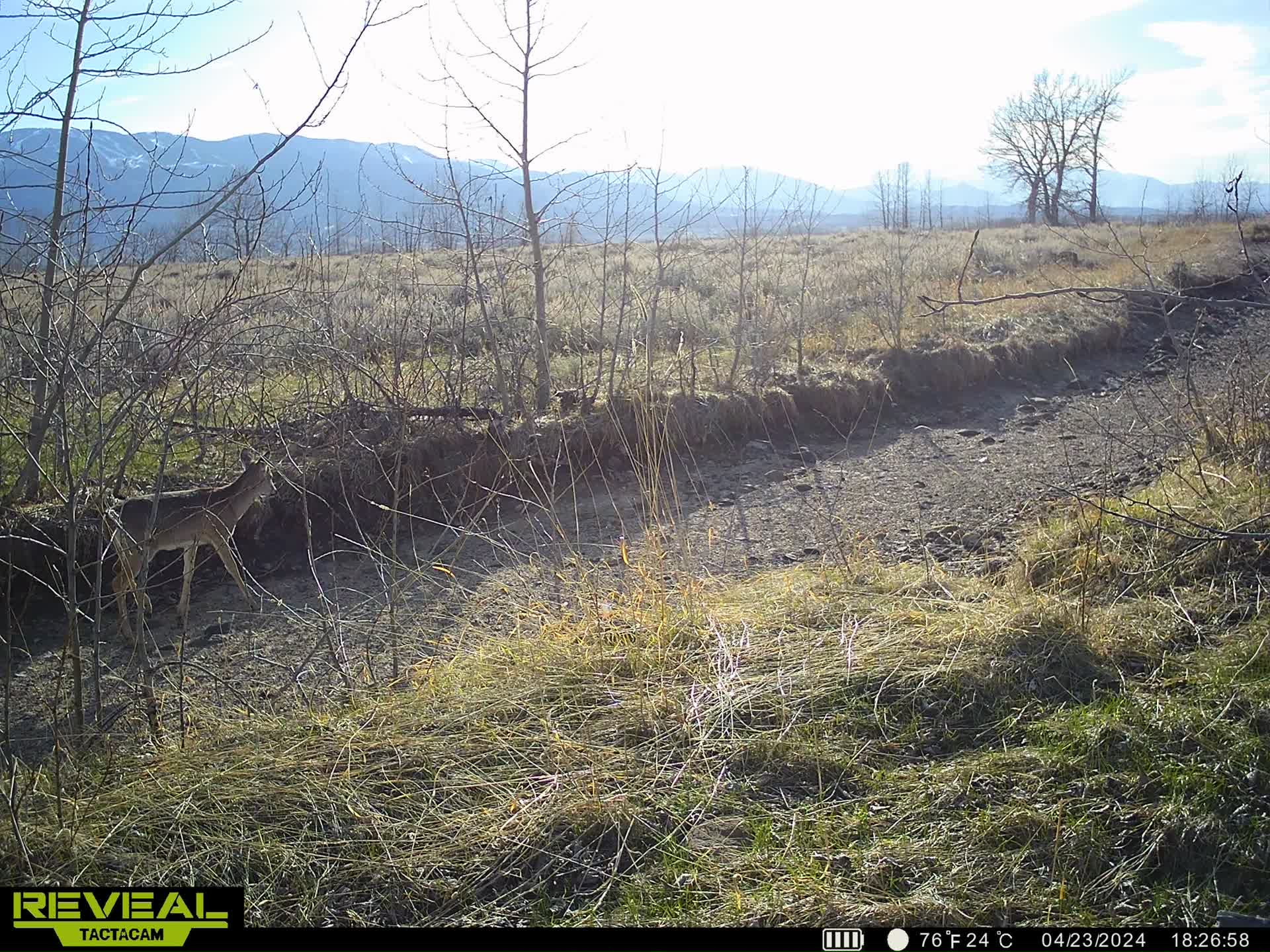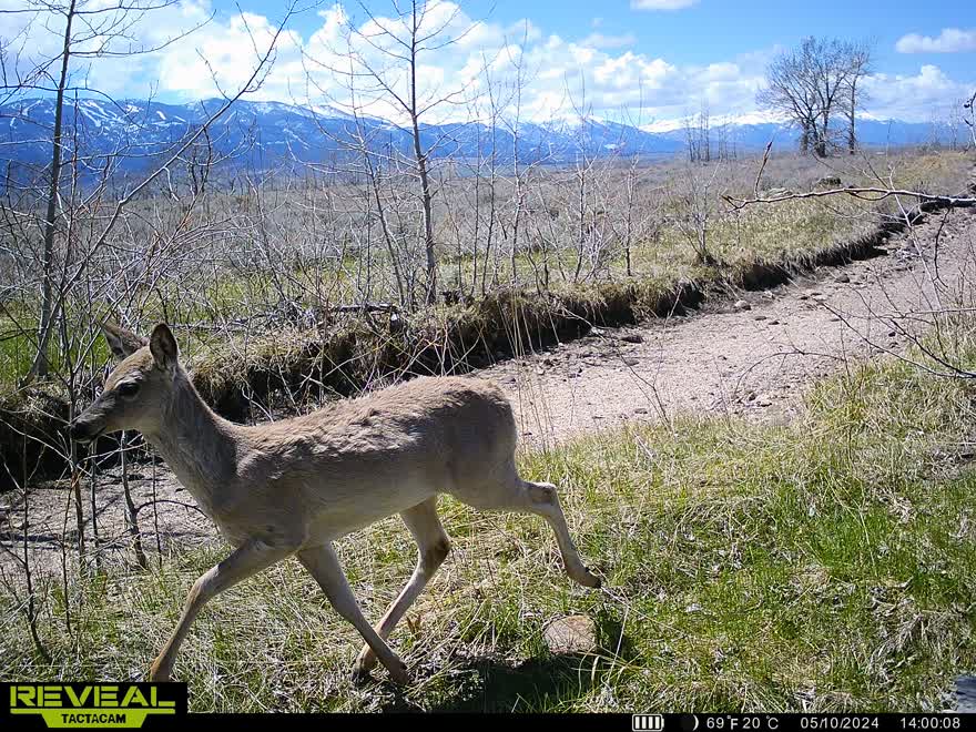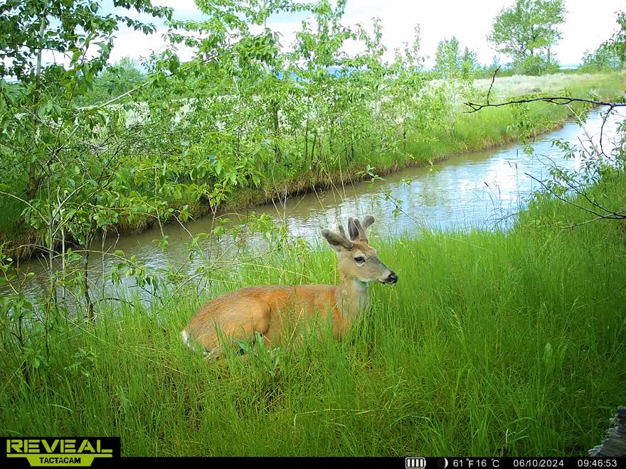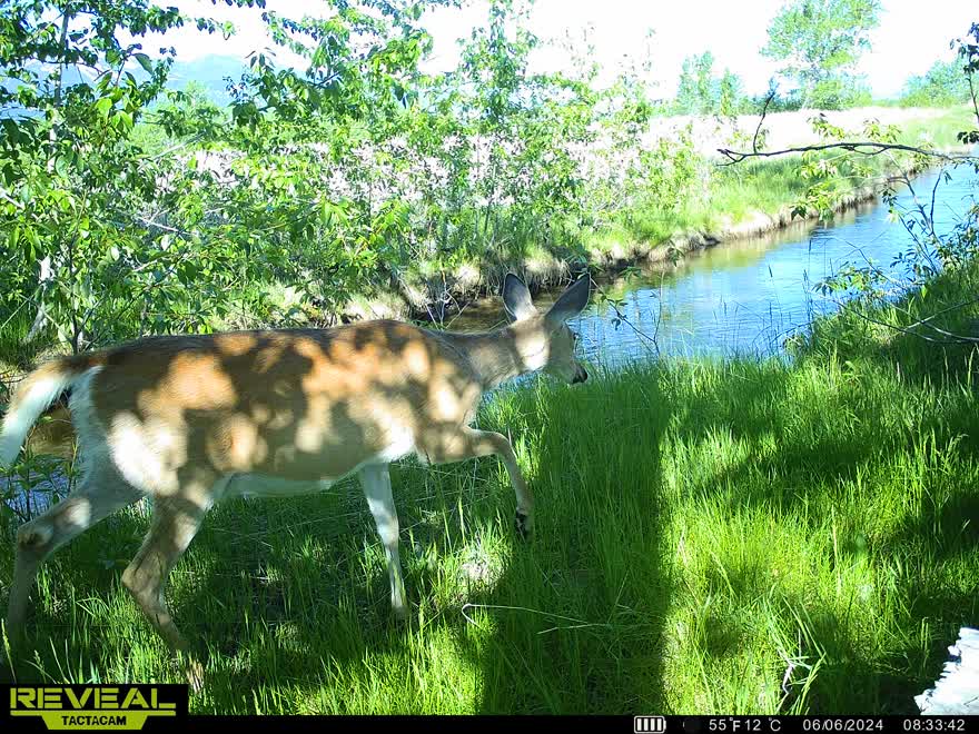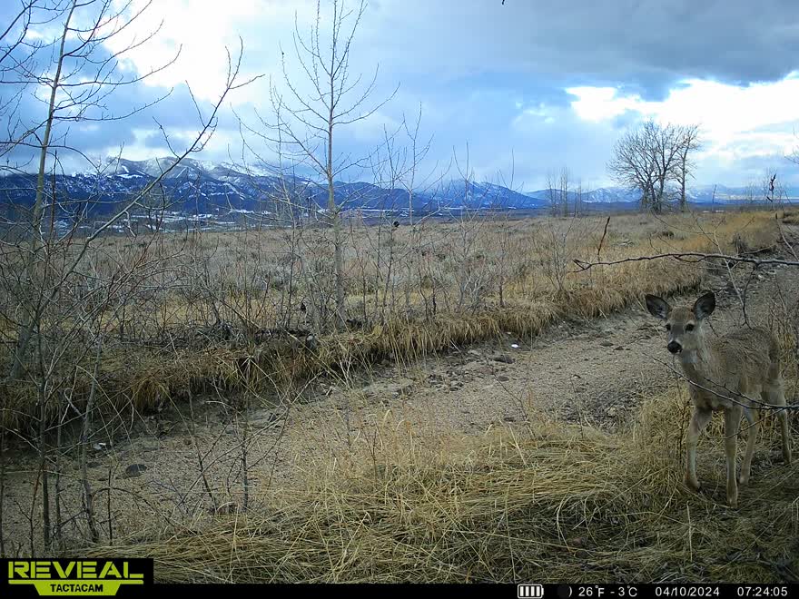 A trail camera has been running on the bench since spring 2024. Whitetail and mule deer most days, red fox and coyote most weeks. Moose, black bear, and mountain lion rarer. These are a curated sampling.