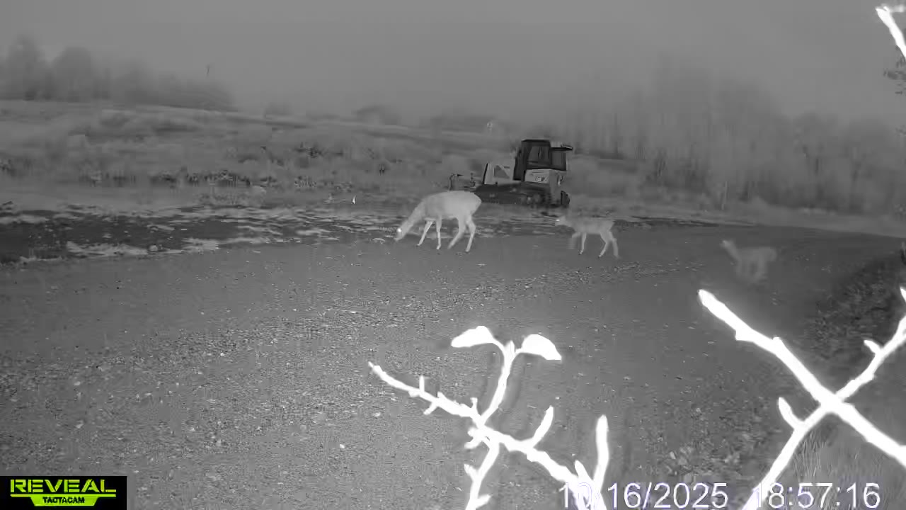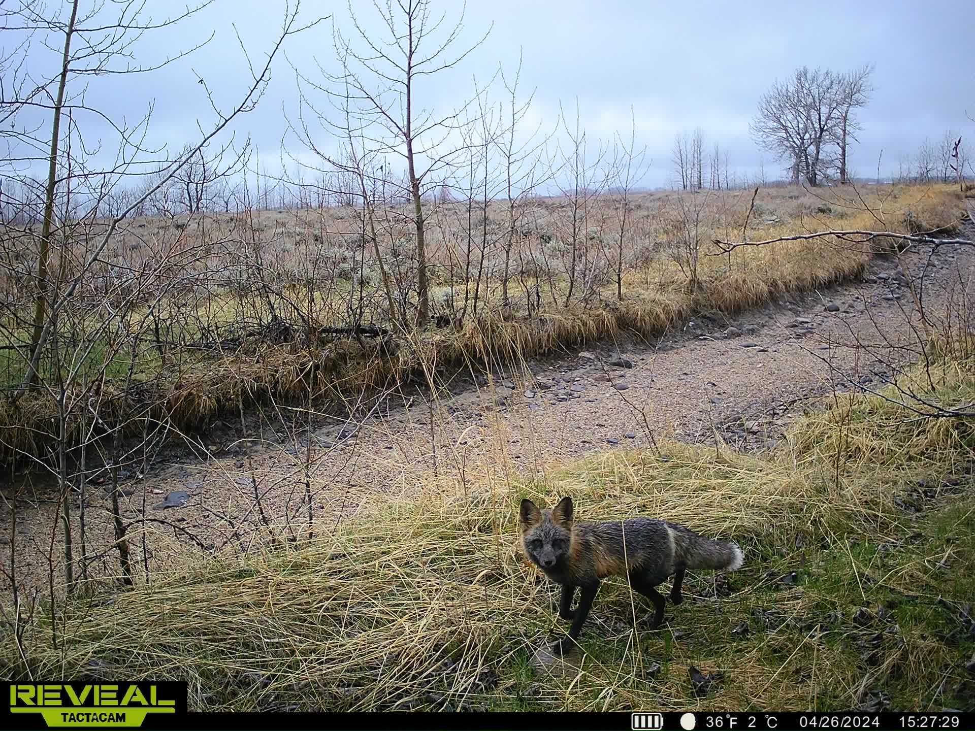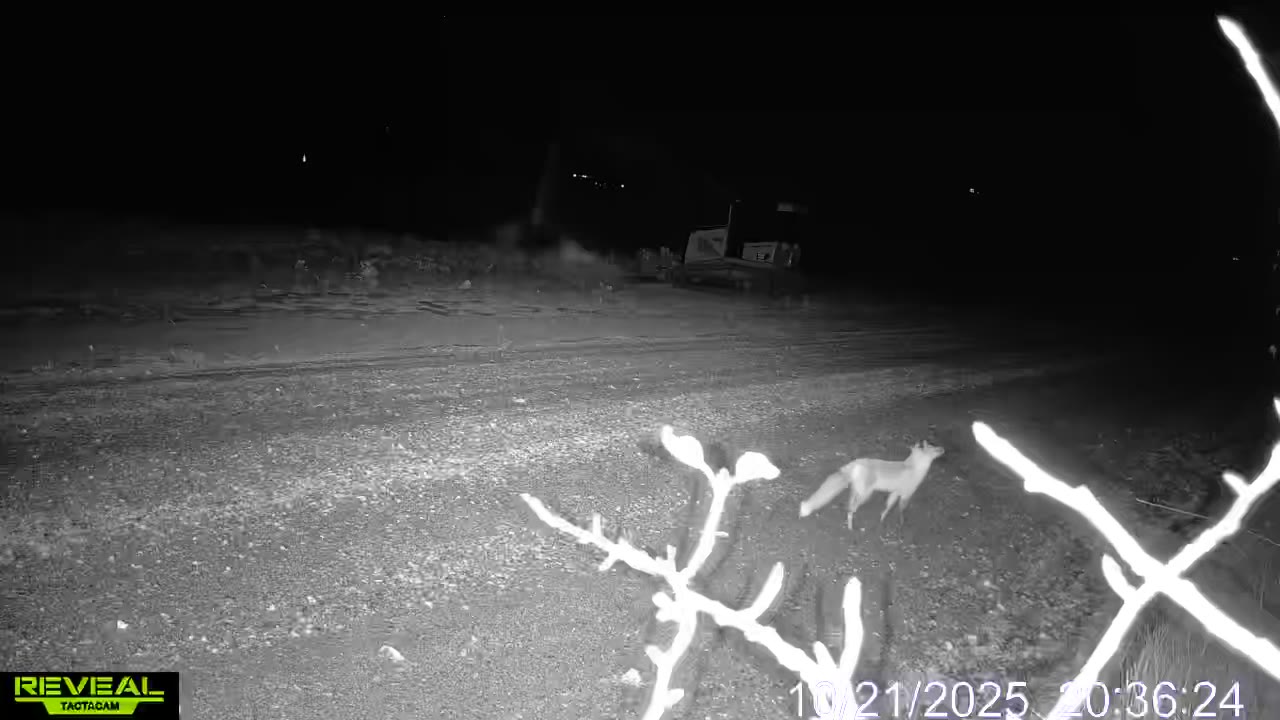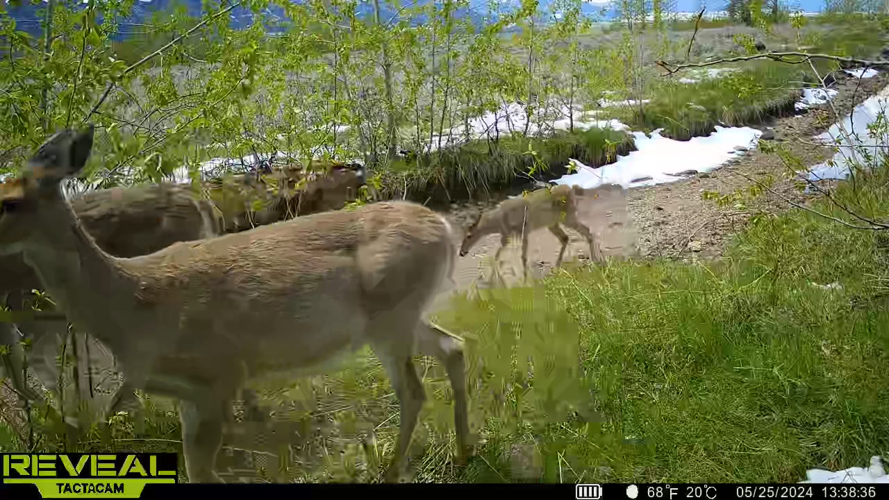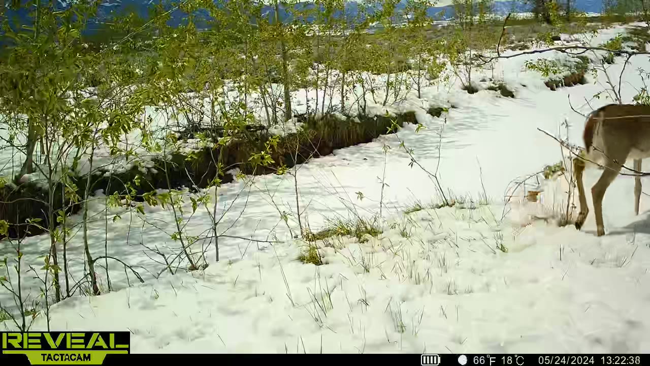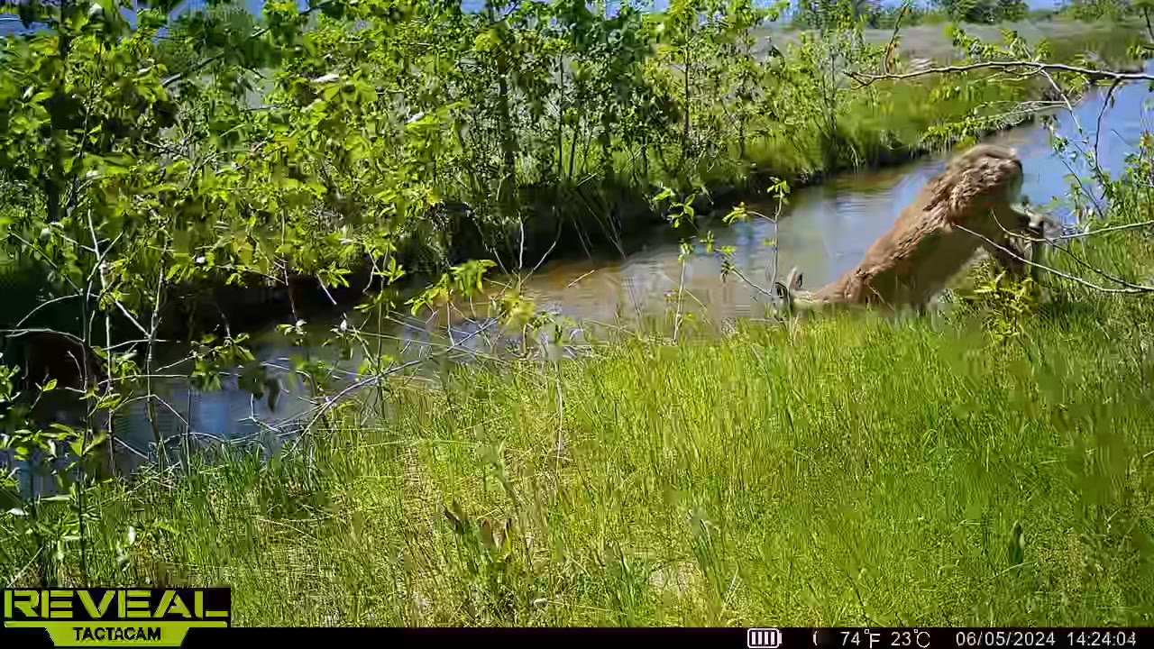 A trail camera has been running on the bench since spring 2024. Whitetail and mule deer most days, red fox and coyote most weeks. Moose, black bear, and mountain lion rarer. These are a curated sampling.